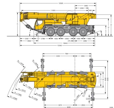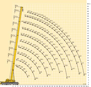 Эта 750-тонная машина имеет универсальное применение со своей 140-метровой основной стрелой, 105-метровым управляемым удлинителем стрелы, 21-метровым монтажным удлинителем, деррик-оборудованием и 400-тонным подвесным противовесом или балластировочной тележкой.
